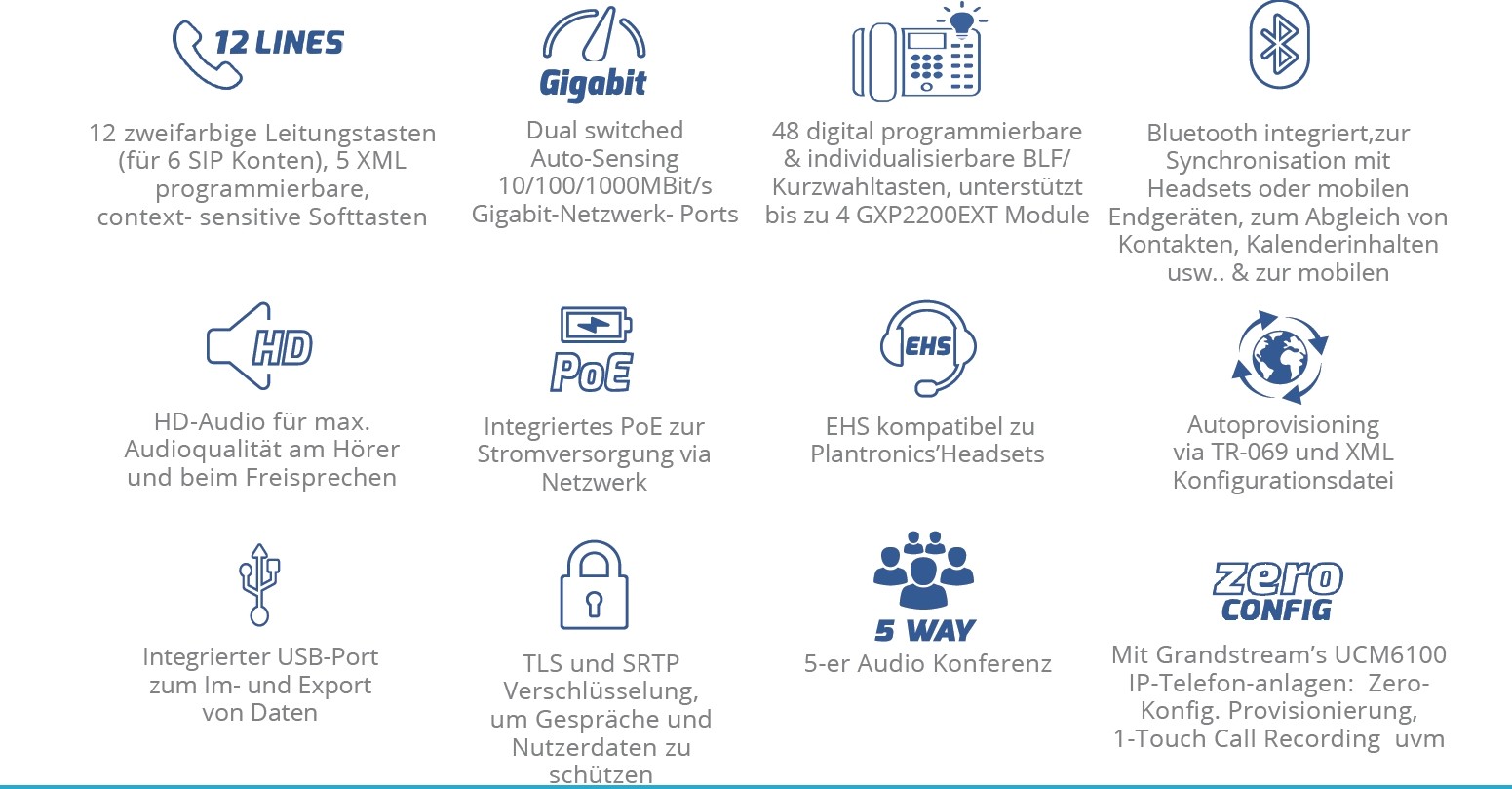 - Unterstützt bis zu 12 SIP-Konten mit 6 Leitungen