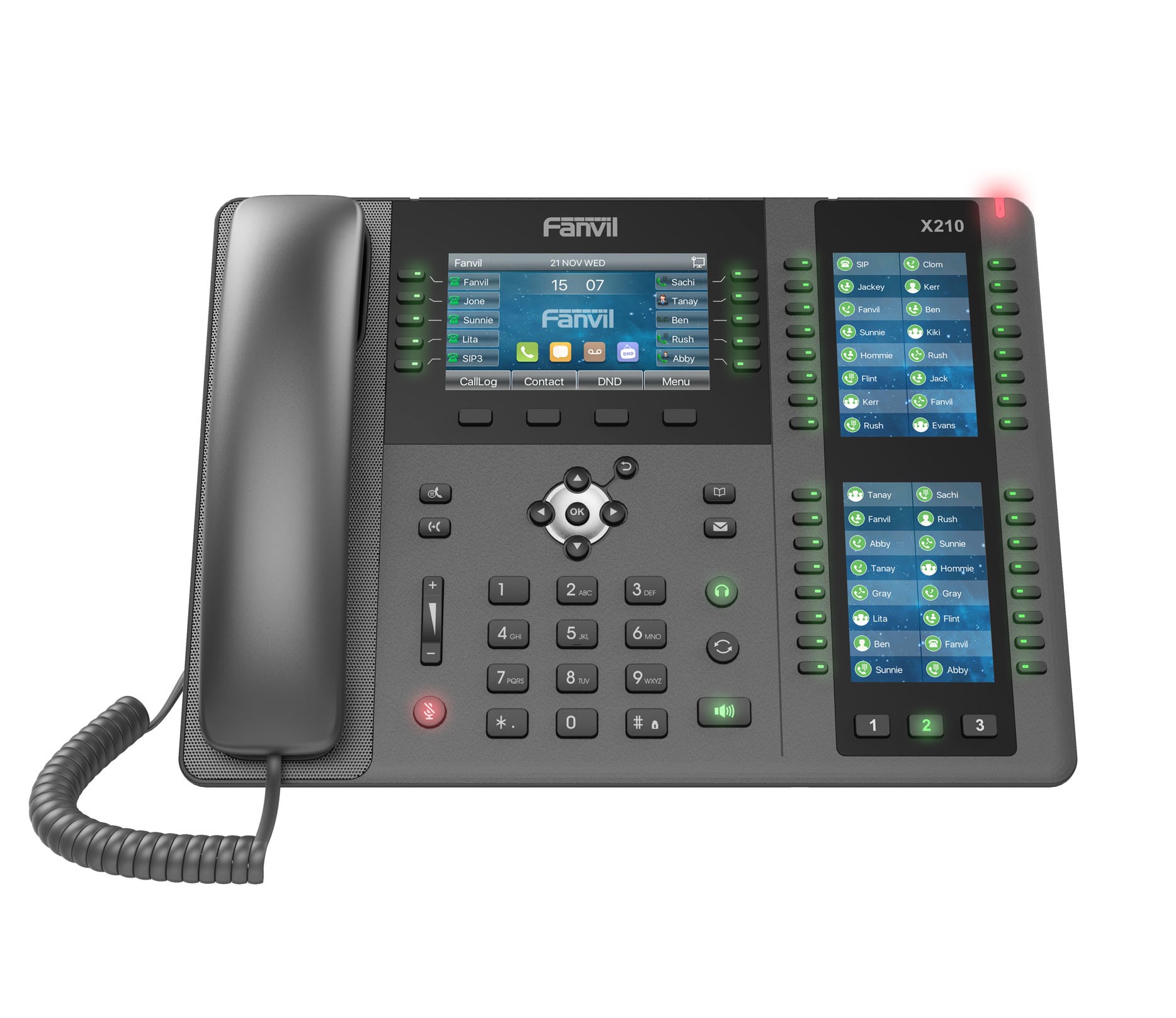 Das Fanvil X210 V2 ist ein Premium-IP-Telefon für Geschäftsprofis mit hohem Anrufaufkommen. Ausgestattet mit drei Farbdisplays (4,3" Haupt- und zwei 3,5" Seitendisplays) bietet es bis zu 106 DSS-Tasten und unterstützt 20 SIP-Leitungen. Dual-Gigabit-LAN mit PoE, integriertes Bluetooth 4.2 und USB-Port für WLAN-Dongle oder Aufzeichnung machen es zum vielseitigen Power-Phone :contentReference[oaicite:1]{index=1}.